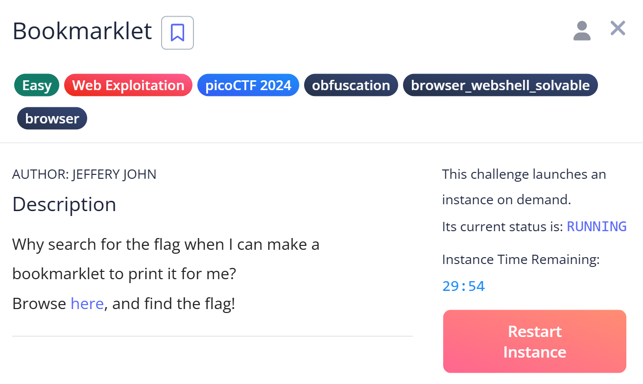 picoCTFの「Bookmarklet」という問題の解説記事です。