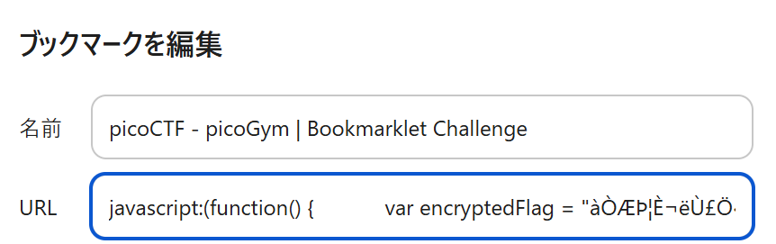 このJavaScriptコードをbookmarkletとしてブラウザに登録して実行することで、フラグを取得できるようです。ステップ2: bookmarkletの登録と実行