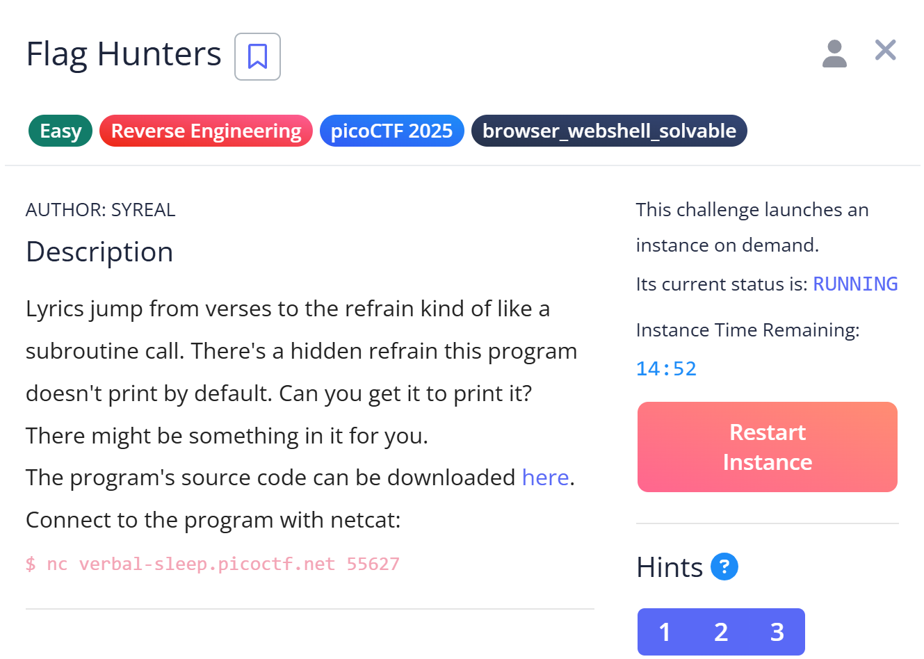 ncコマンドを使用して、指定されたホストとポートに接続します。$ nc verbal-sleep.picoctf.net xxxxx