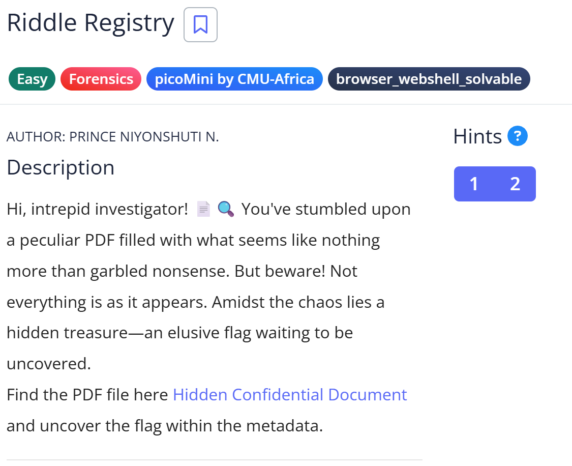 picoCTFの「Riddle Registry」問題では、PDFファイルのメタデータにBase64エンコードされたフラグが隠されていました。