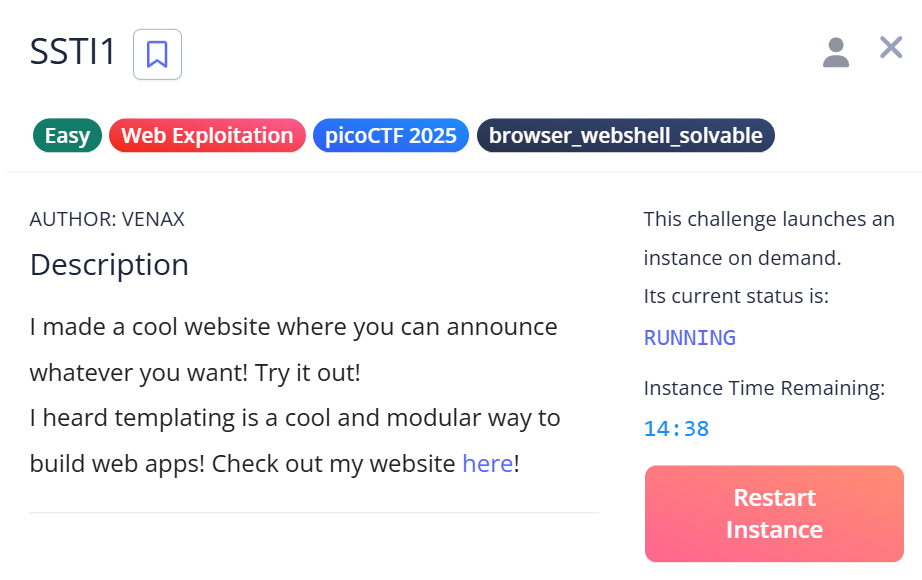templatingとSSTI(Server-Side Template Injection)です。提供されたURLにアクセスし、アプリケーションの挙動を確認します。